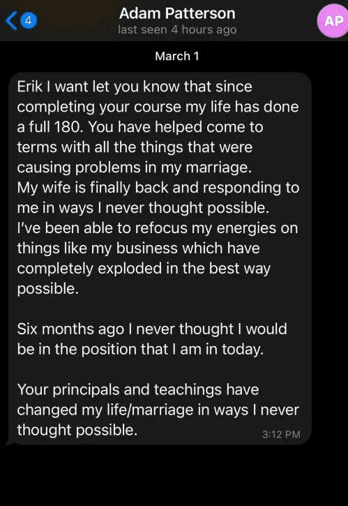 This is where the man stops trying to win her back, and becomes the man worth her chasing after again. I guide him to build a new identity that his wife would be stupid to leave. A man he has never been.